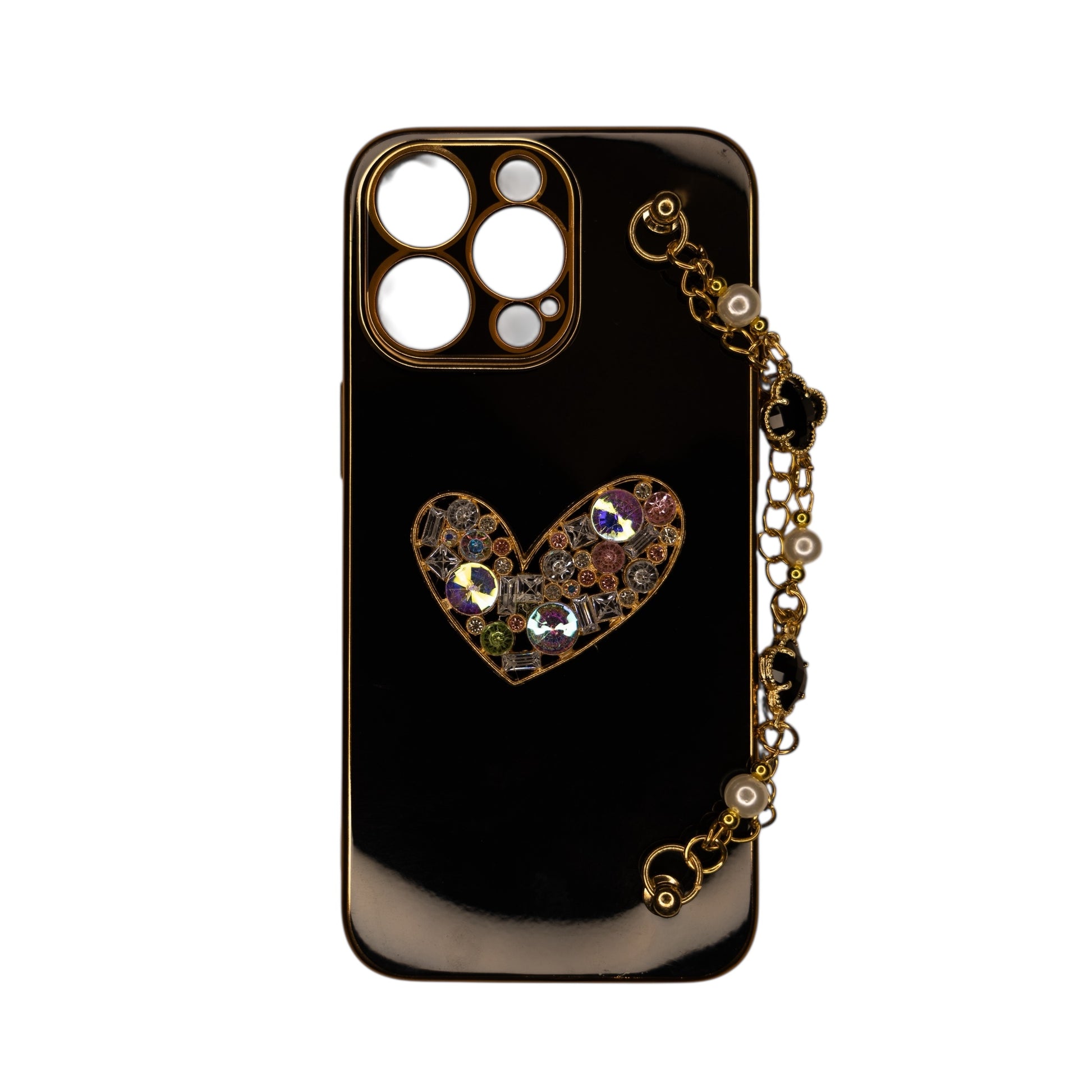 Carcasa 15 Pro Max, silicona negra, con cadena de adorno.