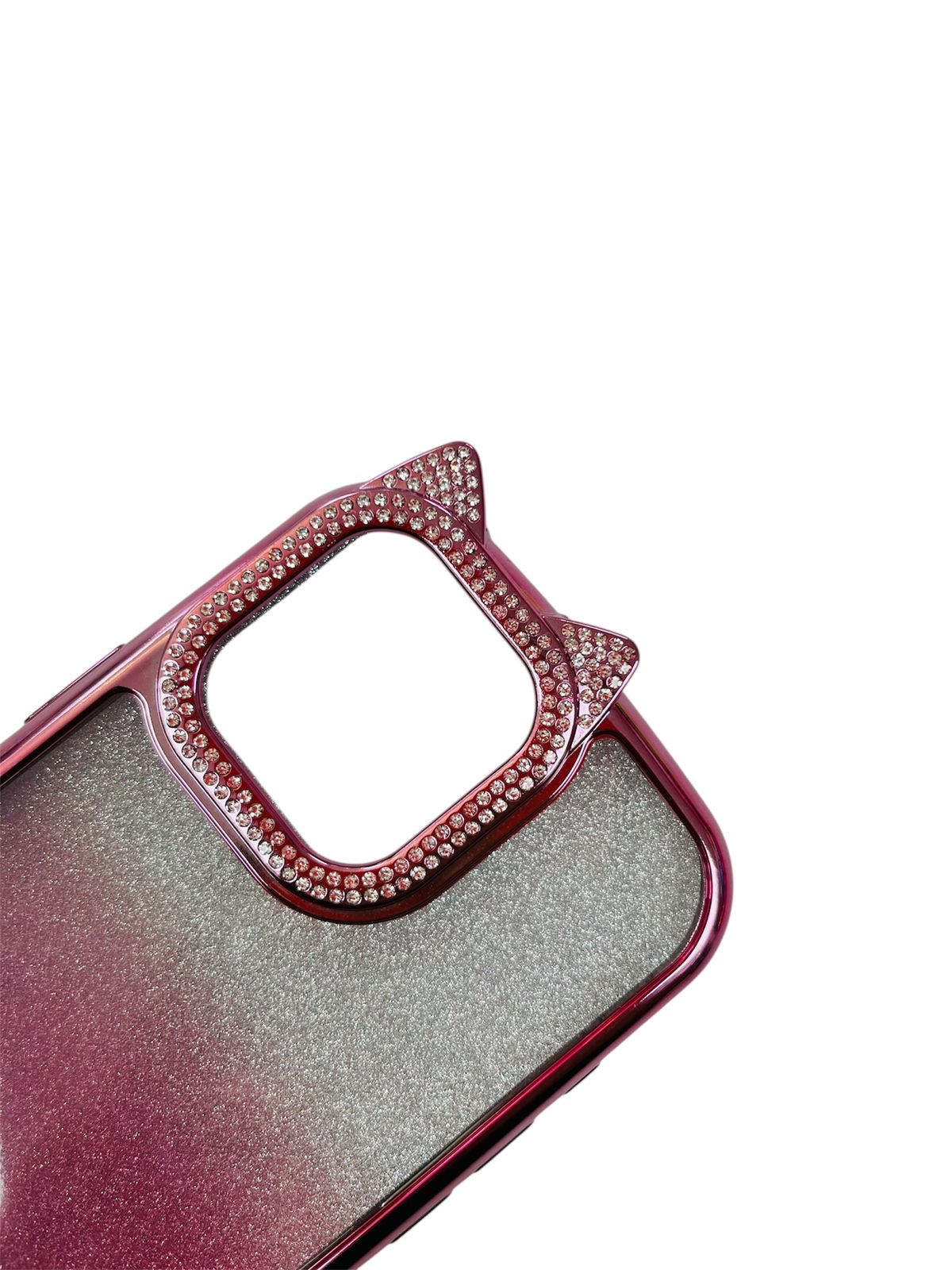 Carcasa rosa con gris y brillos, con adorno de orejas de gato en la cámara.