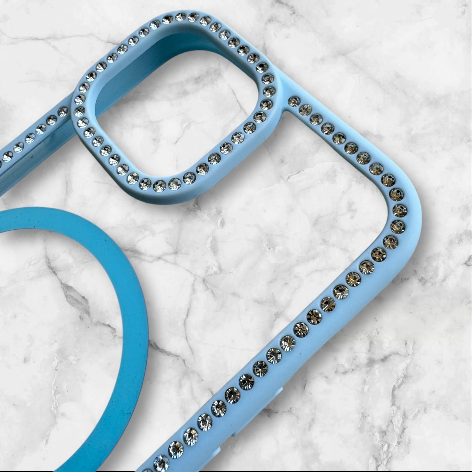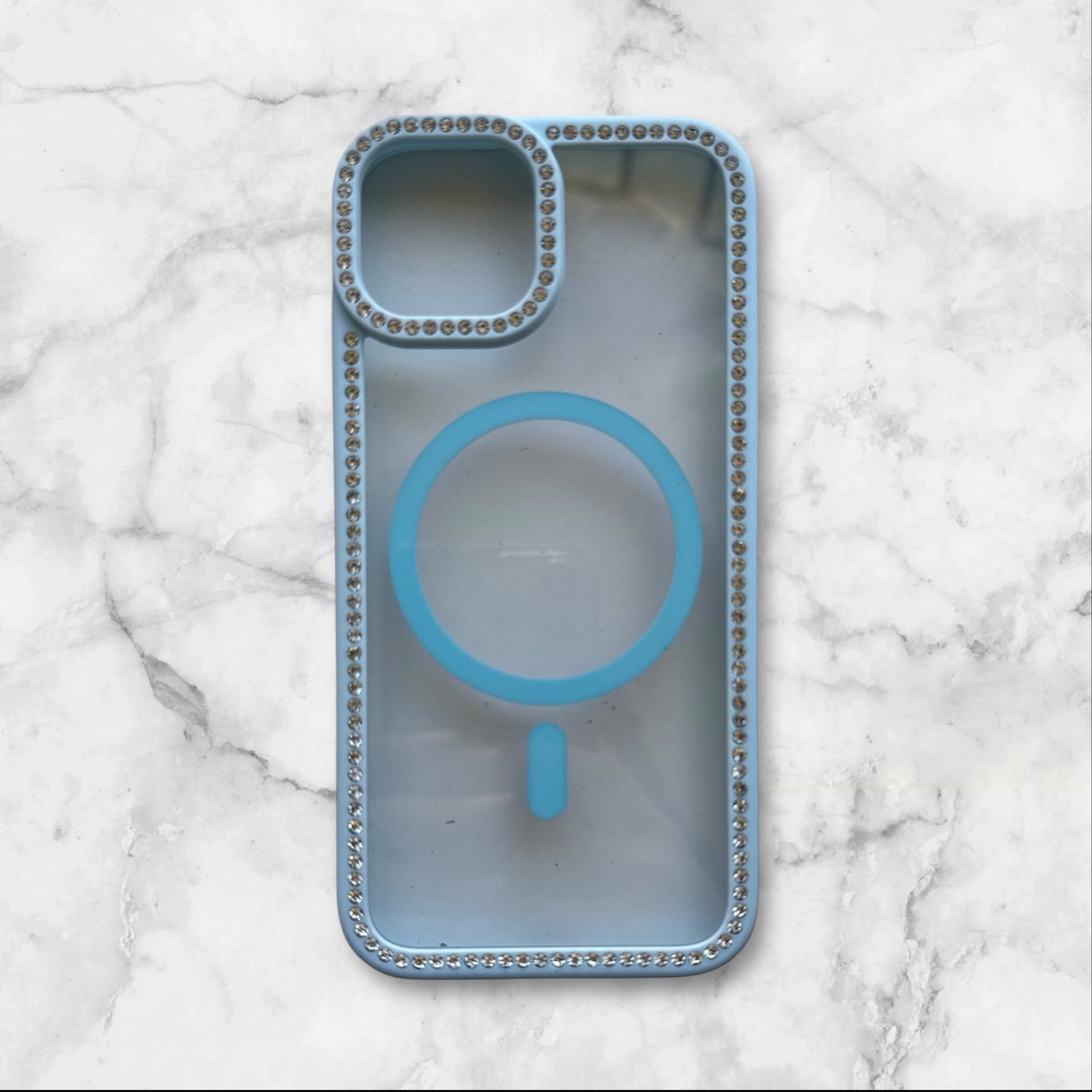 Carcasa silicona transparente con bordes celestes y brillos para iPhone 15, con sistema MagSafe.