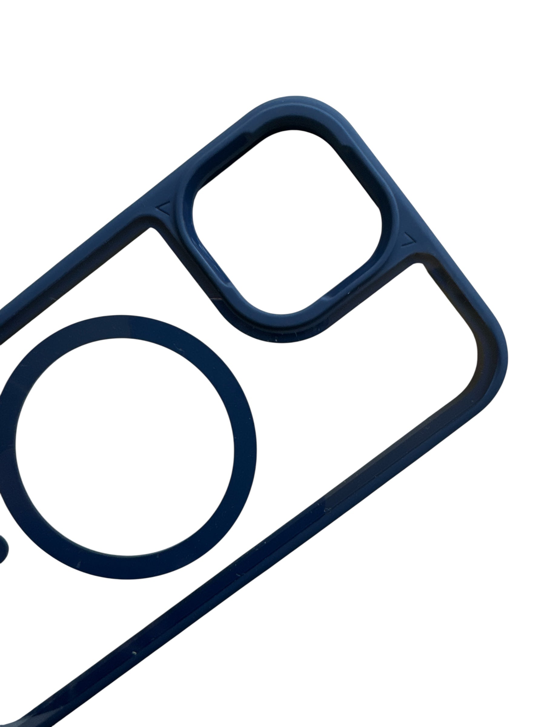 Carcasa silicona transparente con bordes azul y negro para Phone 15, con sistema MagSafe.