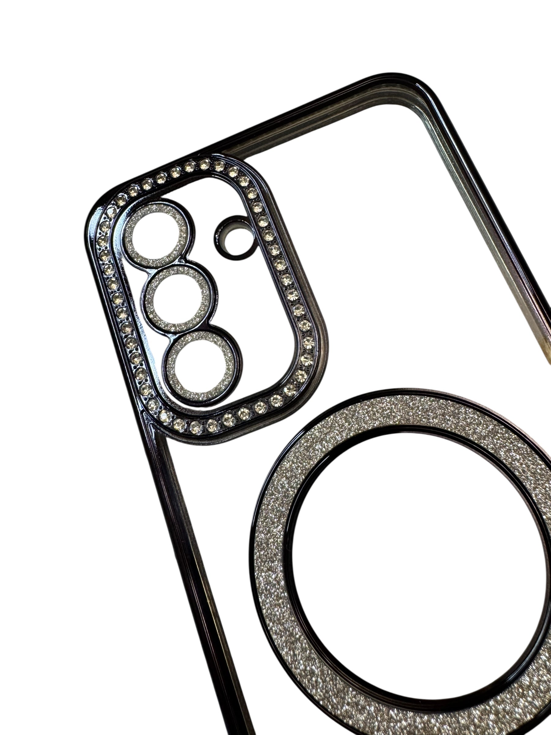 Carcasa Samsung A17 transparente con brillos y Magsafe negro