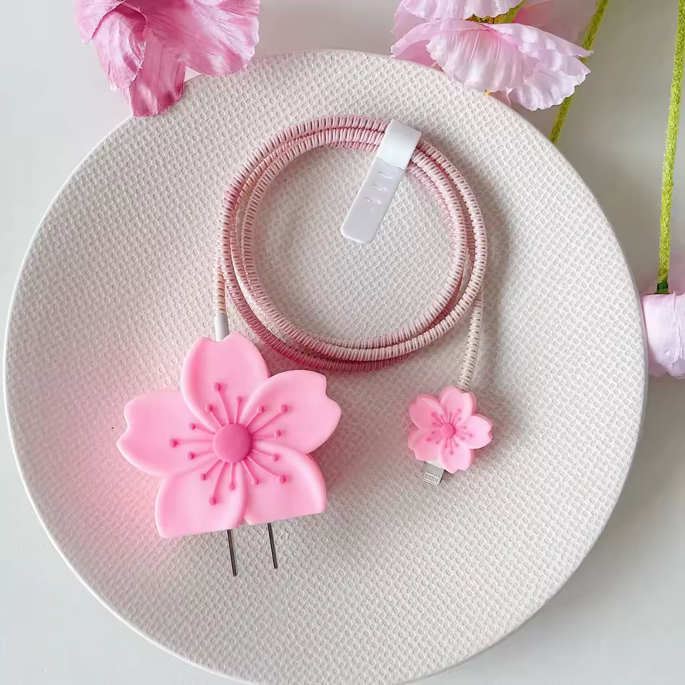 Protector de cargador en forma de flor rosado. Pack contiene espiral, protector de punta, sujetador y protector de caja.